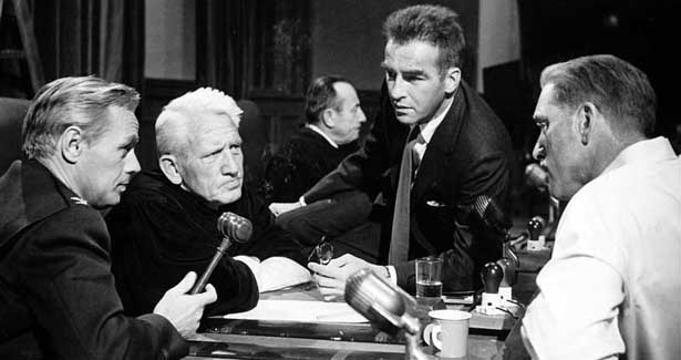 | De izda a dcha: «Richard Widmark, Spencer Tracy, Montgomery Clift y Burt Lancaster en Vencedores o vencidos (1961)» |